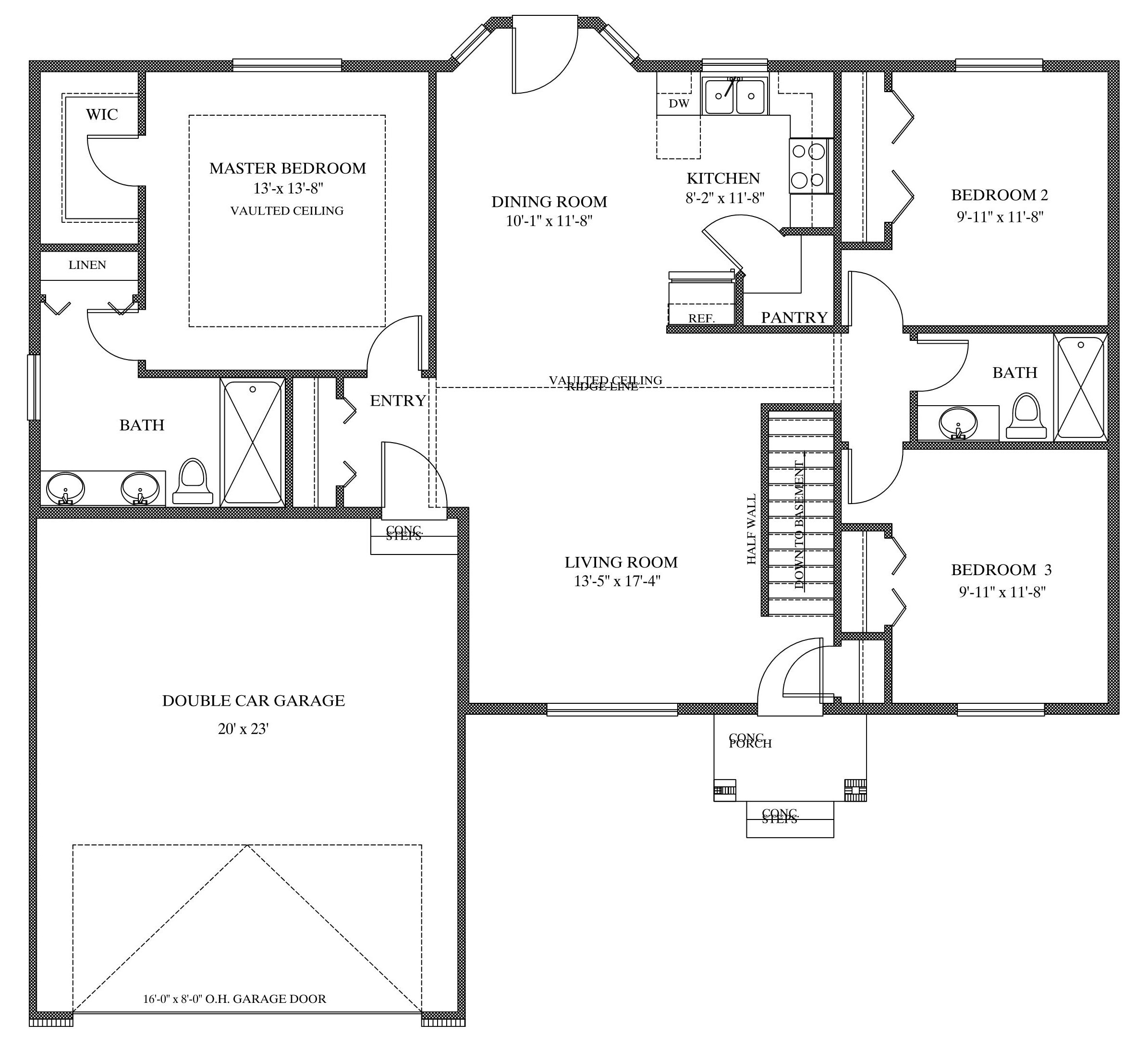 Single Story House Plan with Basement – 1337 Square Feet on Main Floor. Single story House Plan with over 2600 Sq. Ft. --- Five (5) Bedrooms and Three (3) Bathrooms overall with finished basement. Enjoy a 2 Car Garage and Pantry off the kitchen. Plan may be Designed to fit your needs - Call today!