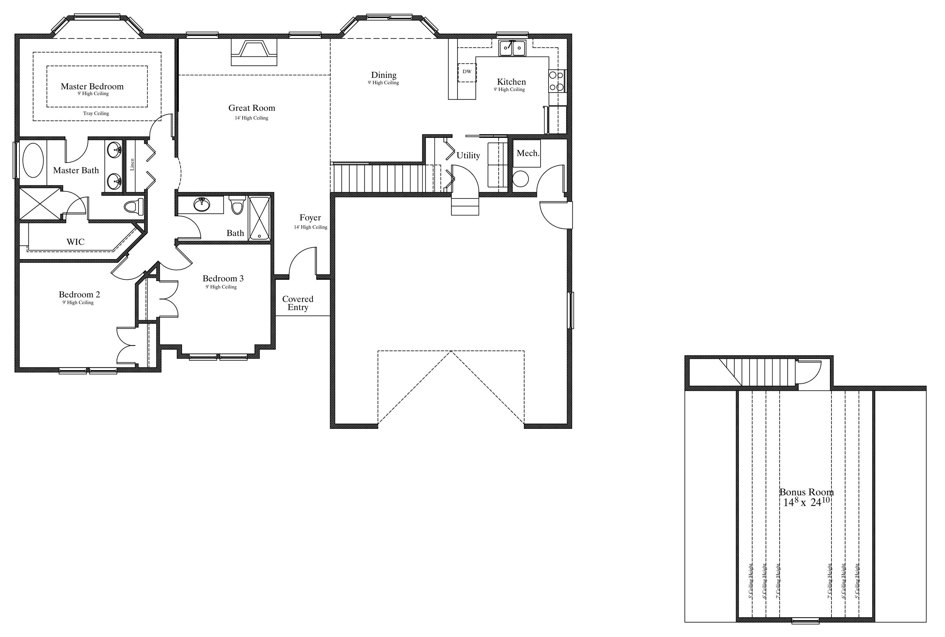Single Story House Plan with Crawl Space – 1664 Square Feet --- Great Single Story Family House Plan with a Crawl Space with 1934 Sq. Ft. with finished. Find 3 Bedrooms and 2 Bathrooms, overall. Main Floor includes a Covered Front Porch, Secluded Master Suite, Mud Room, Corner Jetted Tub, and a 2 Car Garage. Enjoy a nice Bonus Room upstairs. Basement Plan may be Designed to fit your needs - Call today!