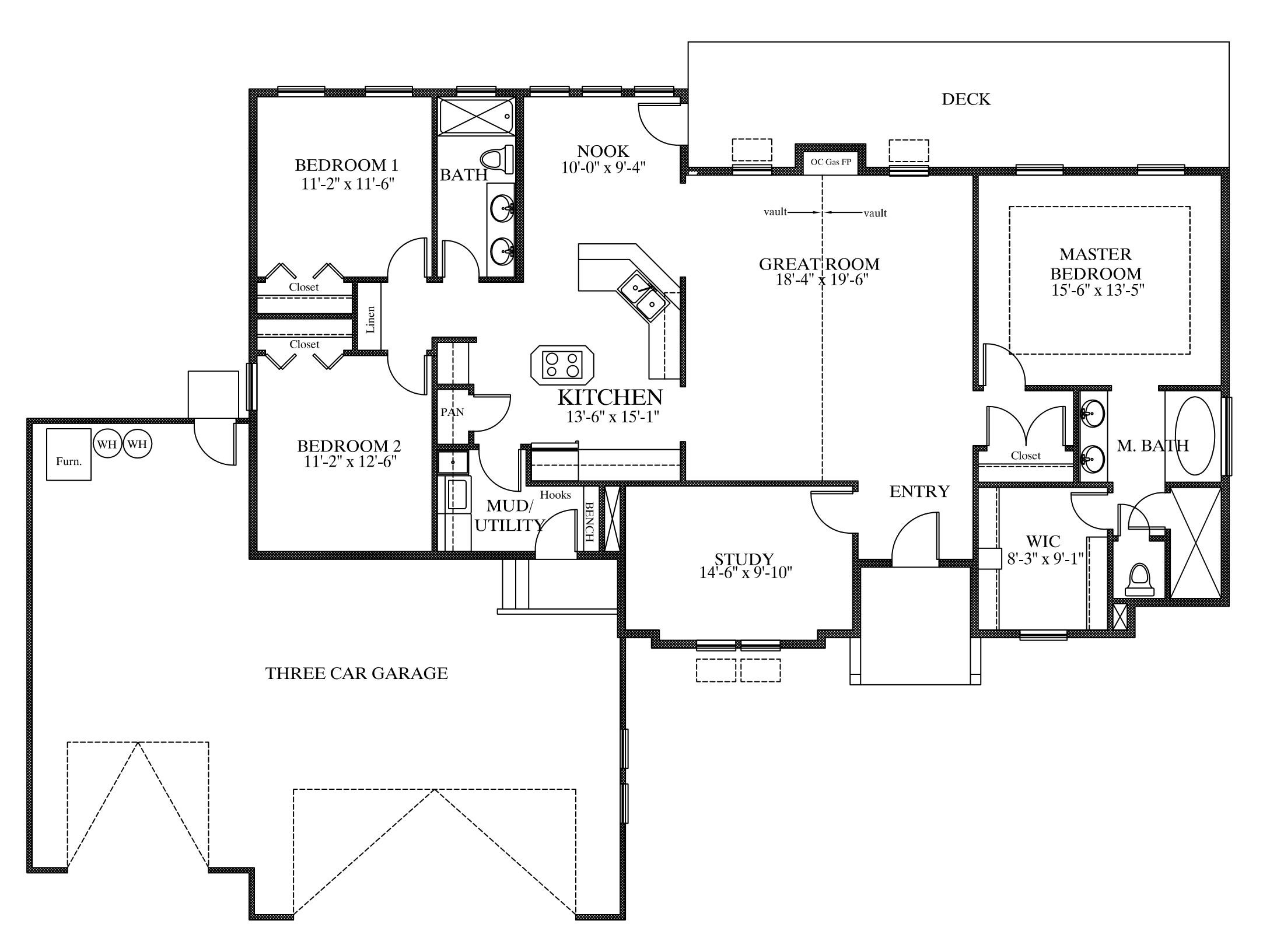 Single Story House Plan Crawl Space – 1868 Square Feet on Main Floor --- Beautiful Single Story Family House Plan providing 1868 Sq. Ft. without a Basement. Plan includes Three (3) Bedrooms, Two (2) Bathrooms, Secluded Master Suite, Fireplace, an Office, and a 3 Car Garage. Plan may be Altered/Designed to fit your needs - Call today!