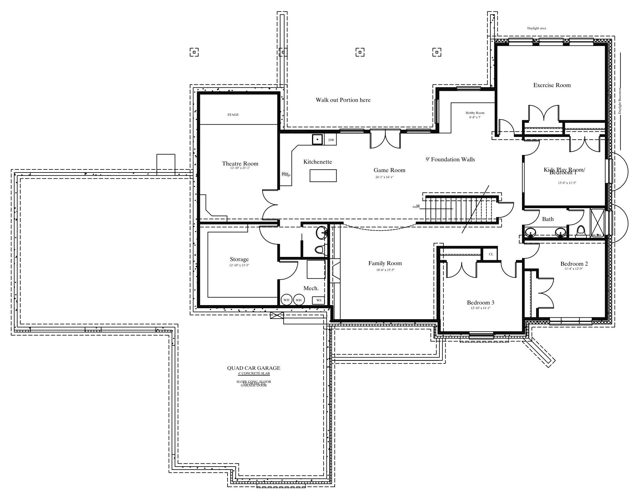 Single Story House Plan with Basement – 2676 Square Feet on Main Floor --- Fabulous Single Story Family House Plan boasting over 5300 Sq. Ft. when completed. Plan includes Seven (7) Bedrooms, Four (4) Bathrooms, and a 4 Car Garage. Main Floor includes a large Great Room, Office, Mud Room, Covered Deck, and Fireplace. Find a Theater Room, Game Room, Exercise Room, Family Room, and large Storage Room in the Basement. Plan may be altered/designed to fit your needs - Call today!