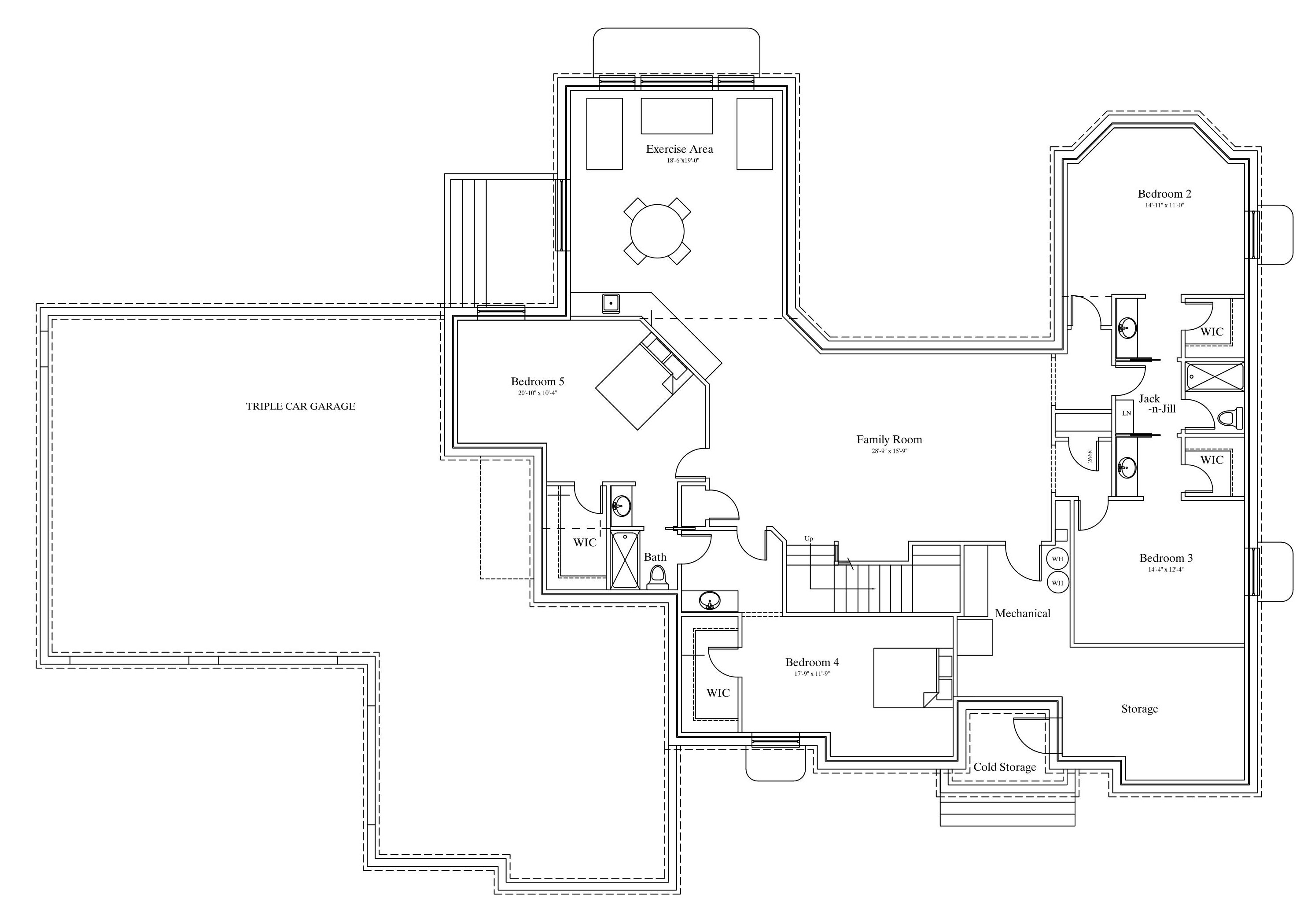 Single Story House Plan with Basement – 5738 Total Square feet --- This very unique plan is both elegant and spacious. Find Six (6) Bedrooms, 4.5 Bathrooms and a3 Car Garage. Two Jack-and-Jill bathrooms in the basement gives lots of access for everyone. A separate living room keeps the kitchen out of view, while the large great room brings the family and friends close together. Plan may be Altered/Designed to fit your needs - Call today!