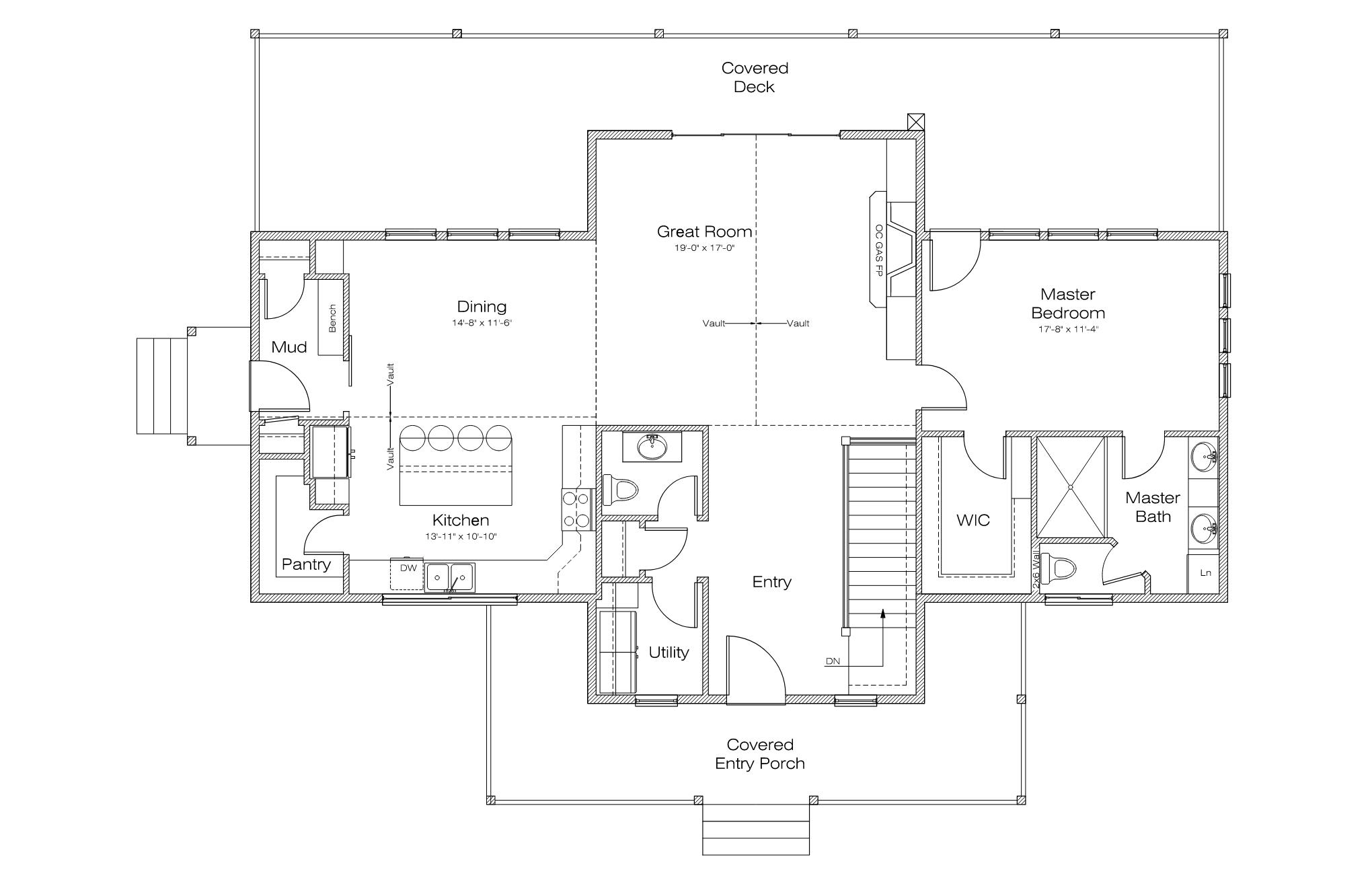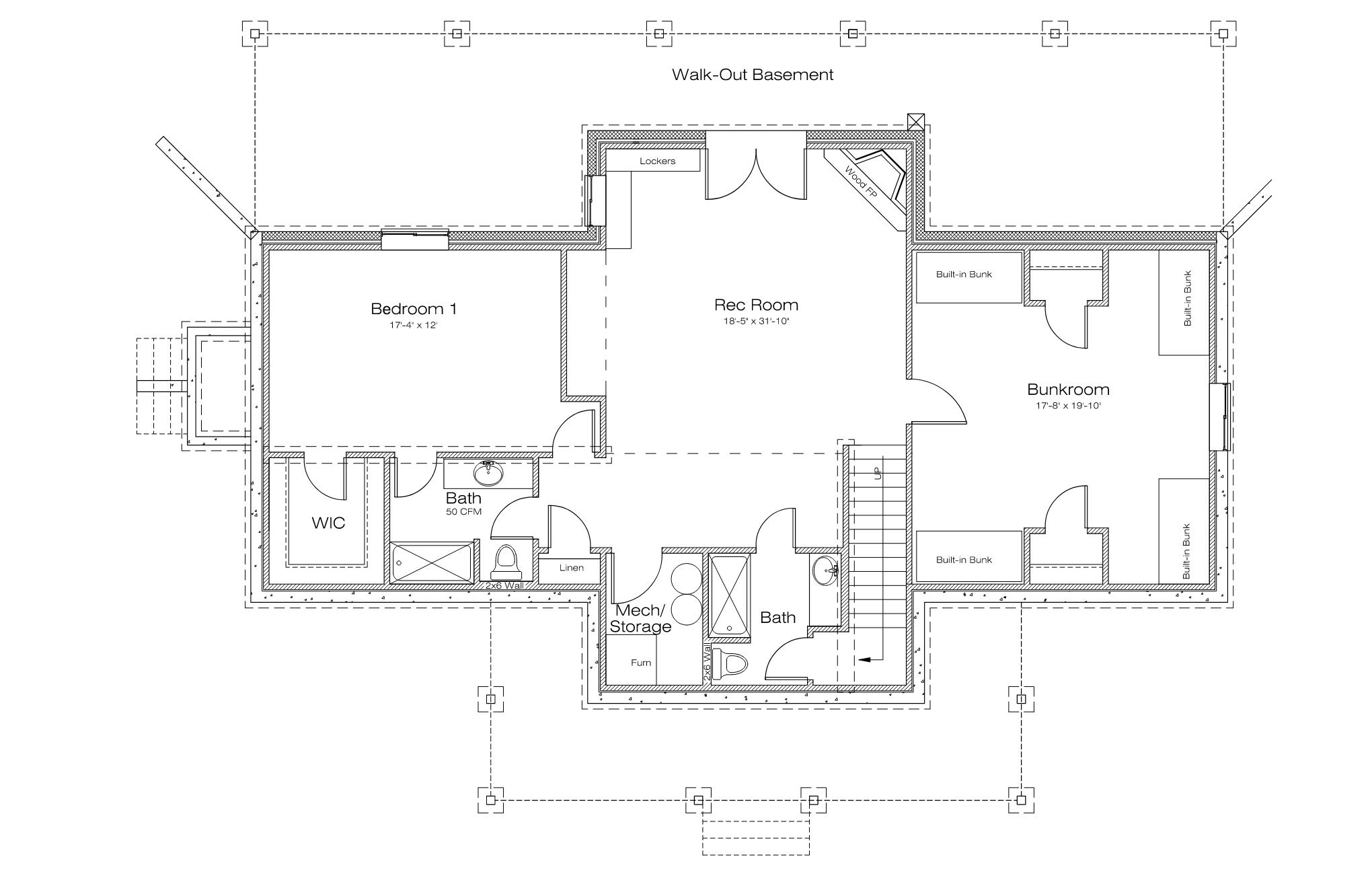Single Story Cabin Plan with Basement – 1516 Square Feet on Main Floor --- Beautiful Single Story Cabin Vacation Plan boasting over 3000 Sq. Ft. with finished. Find Three (3) Bedrooms and Two (2) Bathrooms, overall. Main Floor includes a Covered Front Porch, Mud Room, Secluded Master Suite, and Pantry. Basement includes a Bedroom and Bunkroom. Plan may be altered/designed to fit your needs - Call today!