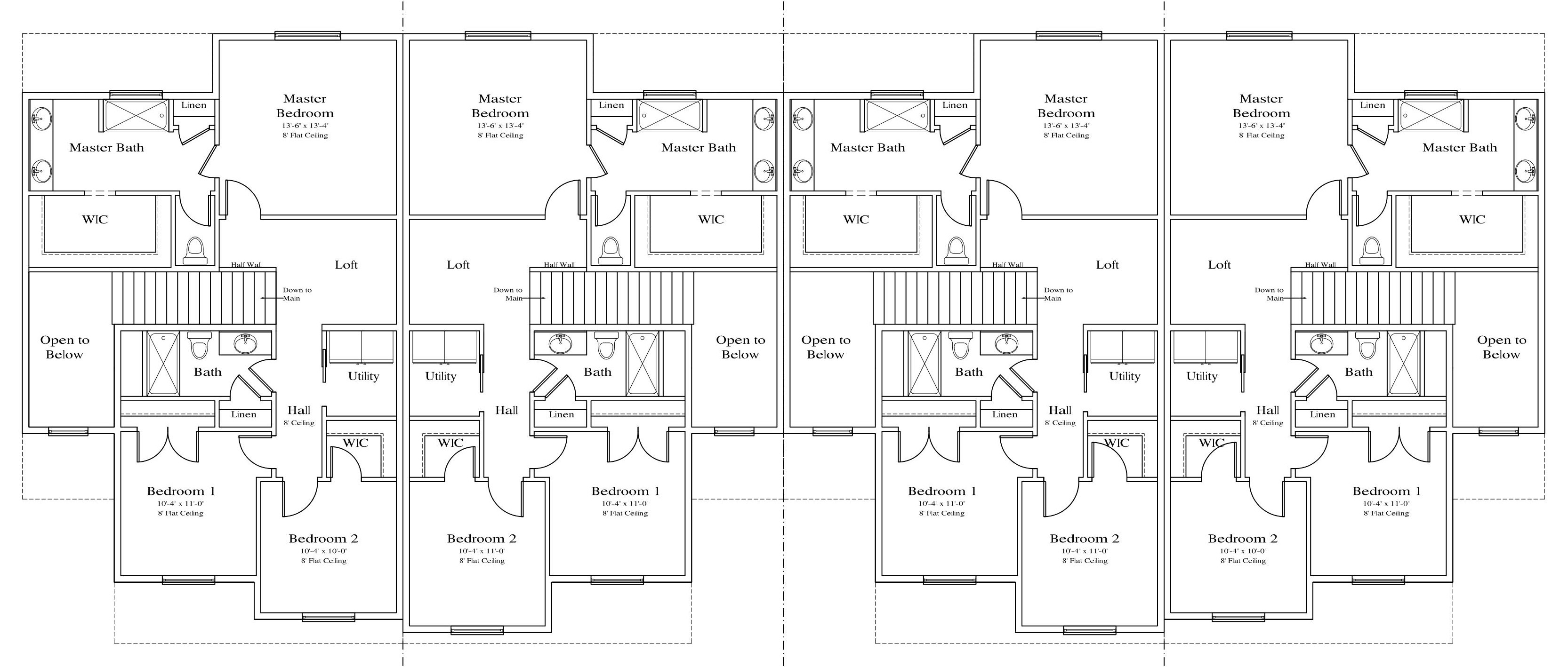 Two Story FourPlex Plan with 722 Square Feet on Main Floor – 1697 Overall EACH --- Stunning Two Story Fourplex Plan boasting nearly 1700 Sq. Ft. with finished, each. Find Three (3) Bedrooms and 2.5 Bathrooms for EACH UNIT. Main Floor includes a Covered Front Porch, Pantry and 2 Car Garage. Secluded Master Suite on Second Floor.